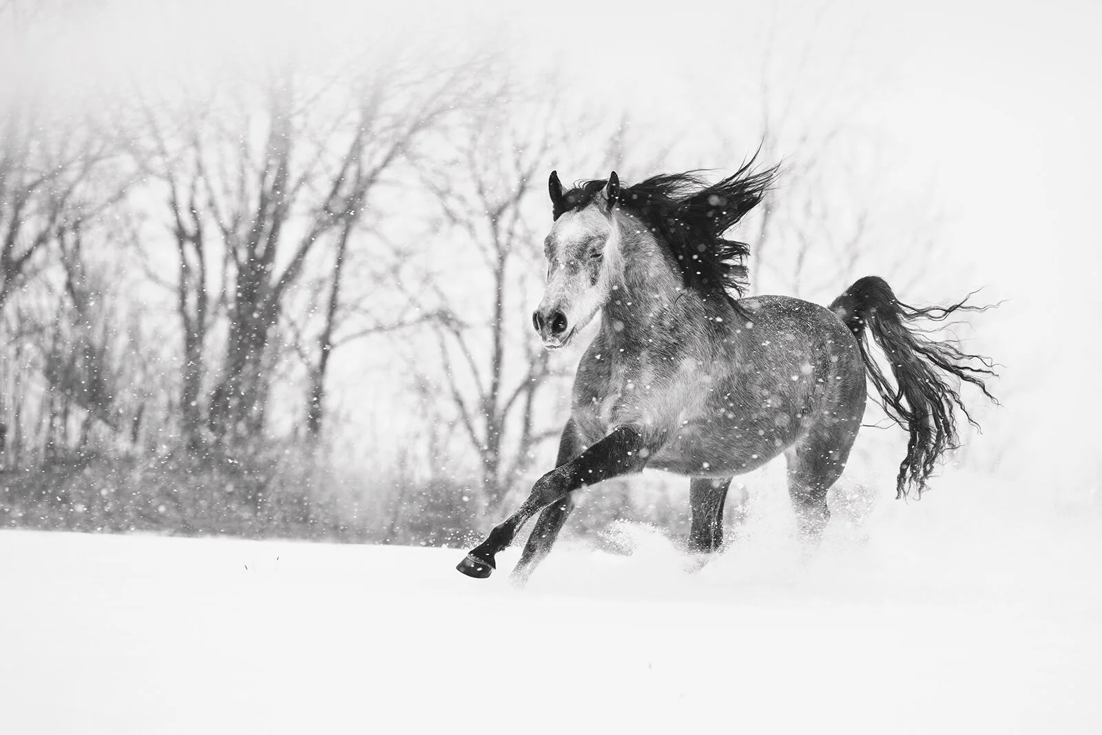 It was day three of the snowstorm, the roads were questionable, and the temperatures threatened sharp pains if you didn’t keep your mittens on, but Qatar didn’t mind the weather at all. My goal was to photograph him at Liberty in the softly falling snow, capturing his beauty and boyish charm. His silliness got the better of me, and as he created his own games, I sat just outside the fence, photographing the little horse play.