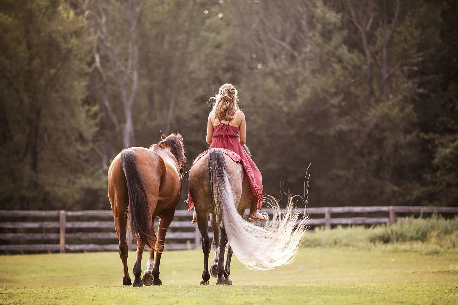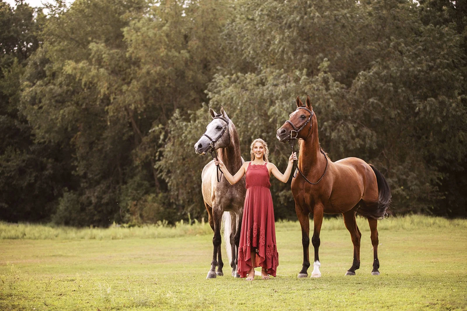 Having seen the sunset photographs of Avery in a Joyfolie dress with her Arabian horse, Kit, Elena’s mother reached out immediately to book a summer photoshoot for her daughter. She hoped to capture the same romantic and whimsical images of Elena and her two Arabians at Foxfield Arabian Farm in Alto, MI.